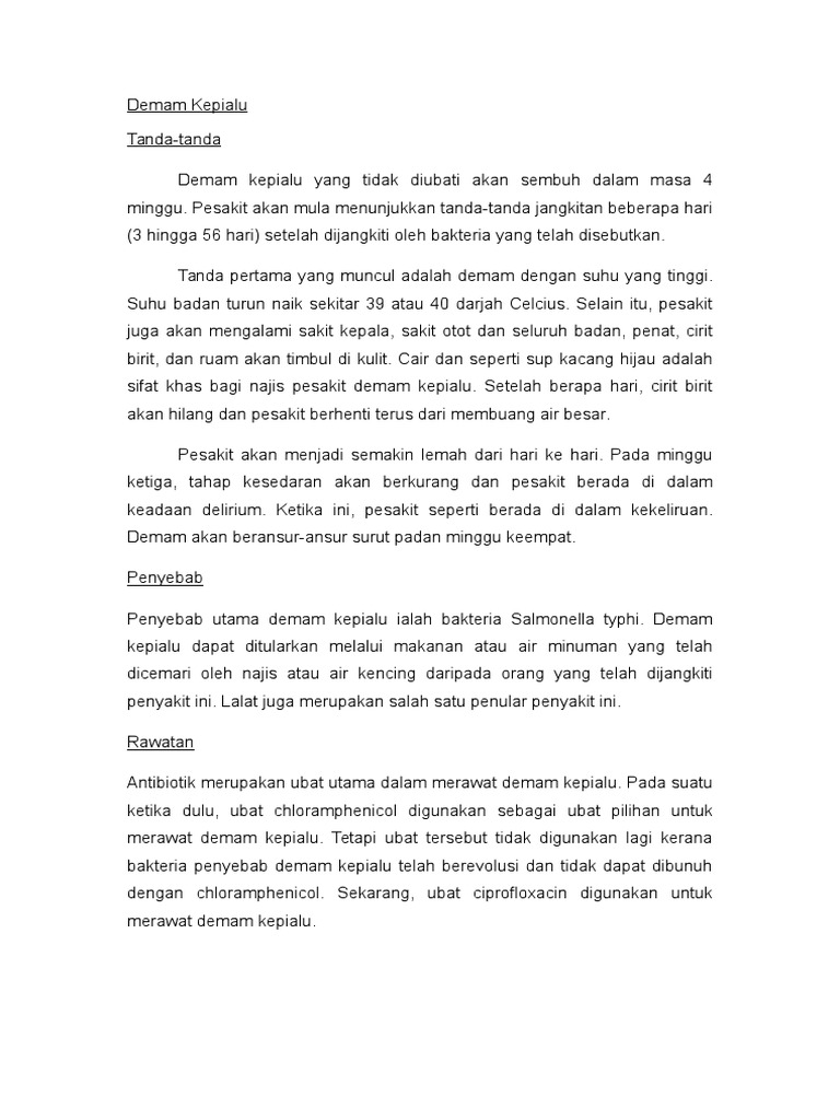 Typhoid Fever Wikipedia from upload.wikimedia.org Kebersihan sekeliling dan makanan yang lebih baik adalah amat penting bagi mengawal demam kepialu. Selalunya terdapat bermulanya demam tinggi selama beberapa hari. Demam kepialu atau demam tifoid ialah penyakit yang boleh berjangkit dengan mudah apabila bekalan makanan atau air dicemari mikroorganisma tersebut. For more information and source, see on this link : Bakteria ini biasanya disebarkan oleh mereka yang dijangkiti atau mereka yang telah sembuh dari gejala tetapi masih mempunyai bakteria di dalam tubuh dipanggil carrier atau pembawa. Ia mudah dijangkiti dan pesakit akan mengalami simptom seperti demam, sakit perut dan sakit kepala yang mungkin berlanjutan sehingga beberapa minggu. Pengendali makanan seperti tukang masak, penghidang dan pencuci pinggan sama ada di gerai atau restoran diwajibkan mengambil suntikan vaksin tifoid (kepialu). Amaran penularan demam kepialu typhoid fever pusat kesihatan universiti.